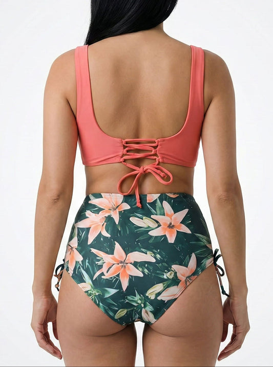 Bikini Plus Size de Cintura Alta con Tirantes Dobles y Estampa Floral Ref: 0652