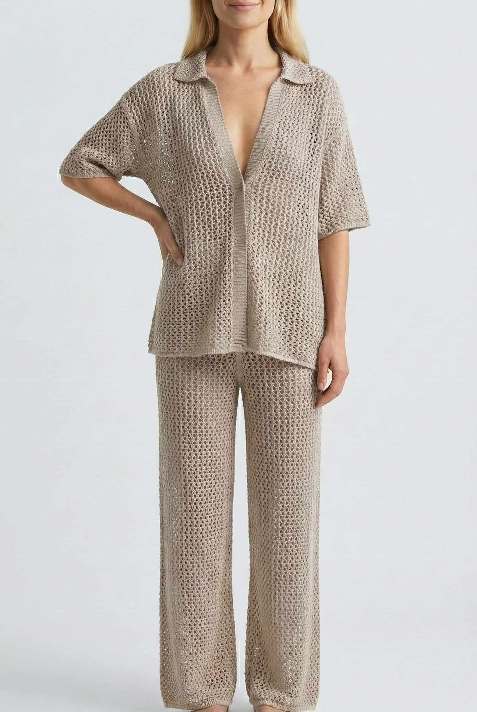 El conjunto en tejido de punto con pantalón flare, integrante de la Colección Resort Editions, une sofisticación y presencia en cada detalle. La camisa presenta un calce ligero, con cuello, botones y abertura frontal que realzan el diseño calado del tejido. Mientras tanto, el pantalón de modelado recto acompaña el cuerpo de manera confortable, con ajuste en la cintura mediante lazada y abertura flare en la botamanga, que aporta movimiento al conjunto. Combinando cada elemento con elegancia, el conjunto transmite refinamiento y carácter exclusivo, completando el look de forma marcada.