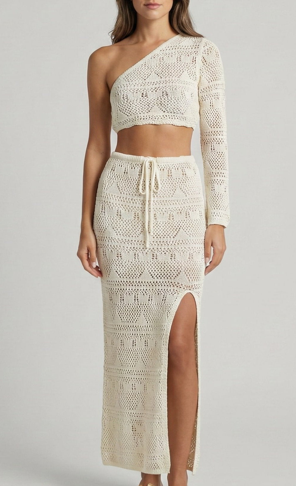 El conjunto en tejido de punto está compuesto por una blusa de un solo hombro y una falda larga. La blusa presenta un escote asimétrico y manga larga en uno de los lados, reforzando el diseño de la prenda. La falda acompaña la silueta de manera natural, cuenta con lazada ajustable en la cintura y abertura lateral, aportando movimiento a la pieza. Parte de la Colección Resort Editions, el conjunto expresa exclusividad y lujo en cada detalle.